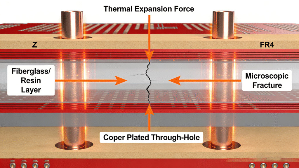 Here is where the physics turn destructive. If the assembly temperature vastly exceeds the board’s Tg limit, the material experiences severe thermal expansion, particularly in the vertical Z-axis. Because the copper vias (the plated holes connecting the layers) and the epoxy resin expand at vastly different rates under Thermal Stress in PCB, a violent mechanical pull occurs internally.