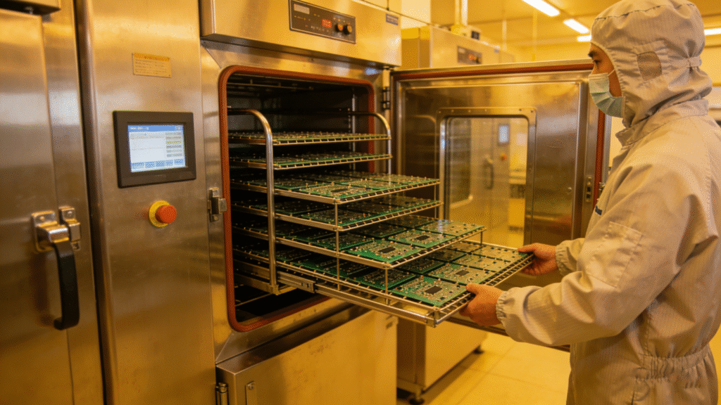 Since moisture is the primary catalyst for delamination, control is paramount. Our factory utilizes strict storage environments for pre-preg materials. Before lamination and assembly, boards undergo controlled baking cycles to drive out any absorbed humidity. This simple but critical step eliminates the “popcorn effect” during reflow soldering.