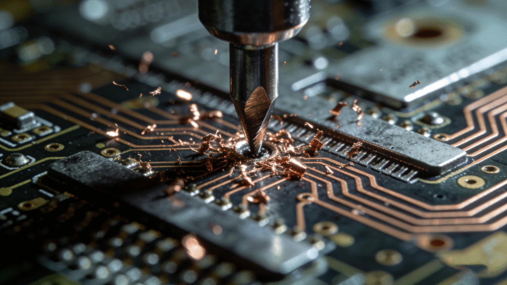 Successfully executing a hybrid design relies entirely on the factory’s capability to manage material transitions. In advanced RF PCB Fabrication, drilling through a hybrid board is a high-risk operation. The drill bit must pass through soft PTFE, hard ceramic fillers, and sticky FR4 resin in a single stroke.
