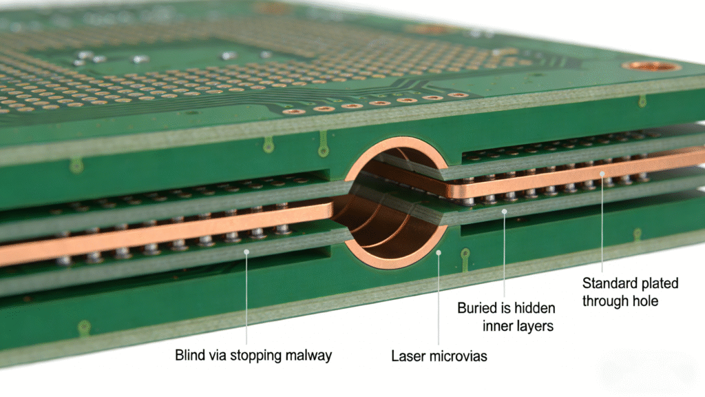The true magic of HDI lies in its three-dimensional routing capabilities. Instead of punching a hole completely through the board, Blind and Buried Vias Technology allows connections to be made only where necessary.